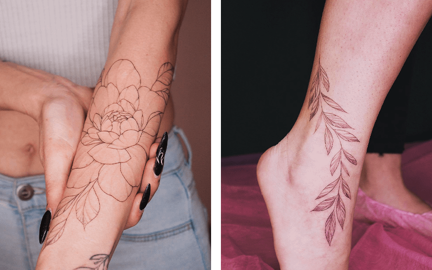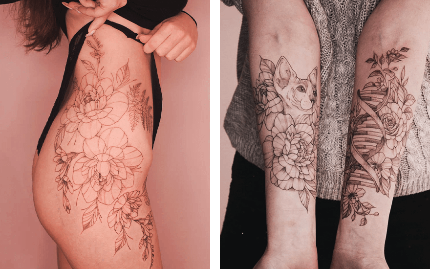 Я делаю тату в стиле fineline — это работа с тонкими линиями. Также люблю цветочную графику, ботанические мотивы. Я объединяю цветы с мандалами, геометрическими линиями, орнаментами из точек. Мои татуировки отличаются невесомостью, легкостью и аккуратностью линий.