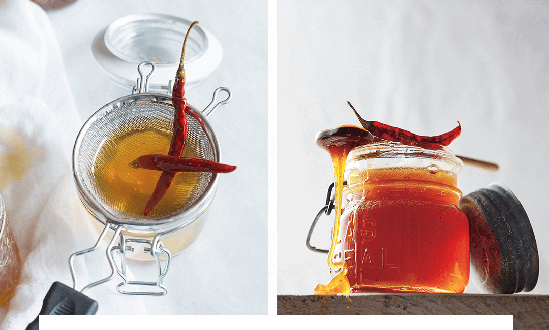 Измельчи сушеные перчики. Смешай с медом и солью в небольшой кастрюле и нагревай на среднем огне 15 минут. Сними кастрюлю с огня и дай остыть в течение часа.