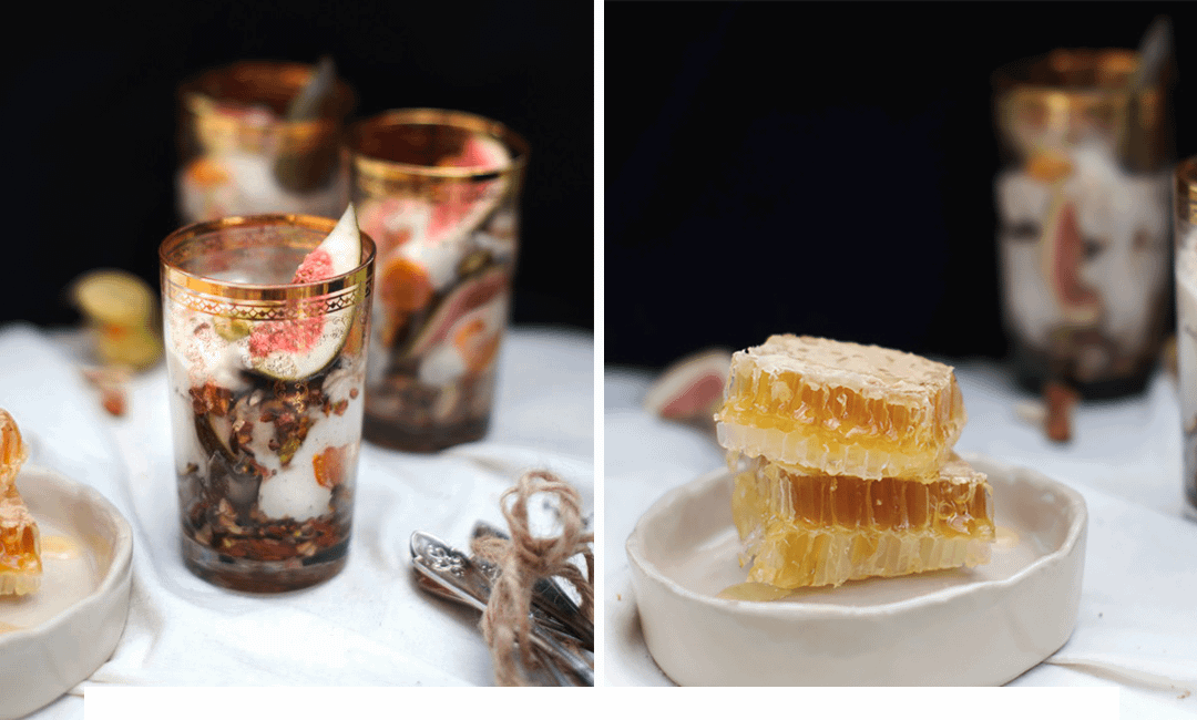 Для подачи выбери глубокий стакан, вылей в него крем, а затем посыпай медовыми орехами, инжиром и любыми другими фруктами. Подавай с нарезанными кусочками пчелиных сот.