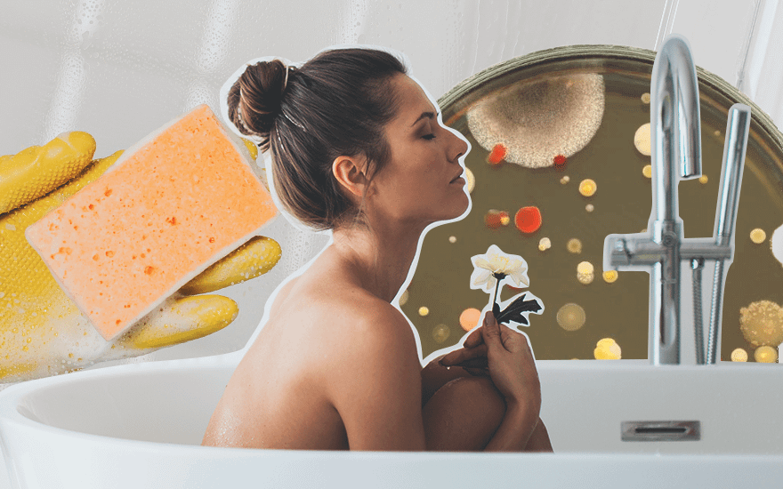 Просто стереть с ванны видимую грязь недостаточно, справиться с бактериями может только специальное средство. Начинай чистку с верхней части ванны и двигайся вниз. После обработки средством тщательно прополощи поверхности.