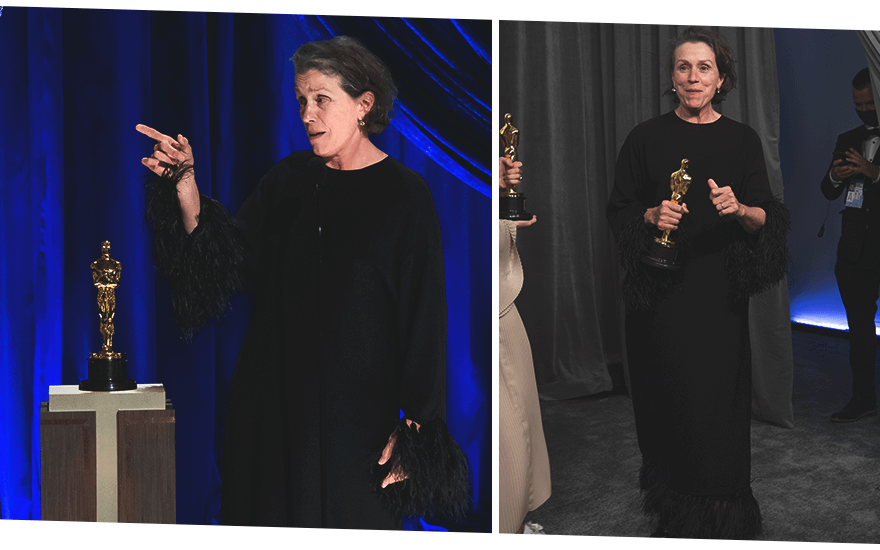От речи Макдорманд всегда ждут неожиданностей, и этот год не стал исключением. Актриса сказала: «Мы посвящаем награду нашему Волку», — и завыла на сцене. Только позже зрители узнали, что таким образом она отдала дань уважения звукорежиссеру «Земли кочевников» Майклу Вульфу Снайдеру. Он покончил с собой в начале года после того, как долгое время страдал от депрессии.
