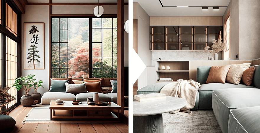 К слову, в интерьеры джапанди идеально вписывается мебель с небольшими изъянами или потертым видом. А еще стоит выбирать низкие столы, пуфы, диваны и кресла для того, чтобы визуально увеличить пространство.