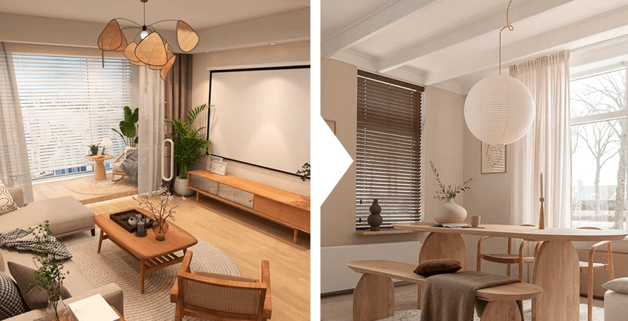 Интерьеры в стиле джапанди наполнены естественным светом. Поэтому стоит сменить тяжелые шторы на легкие занавески или жалюзи. Отметим, что лучше всего прибегнуть к такому решению в столовой, гостиной или на кухне. А вот в спальне всё же стоит оставить плотные шторы, чтобы обеспечить темноту для сна.