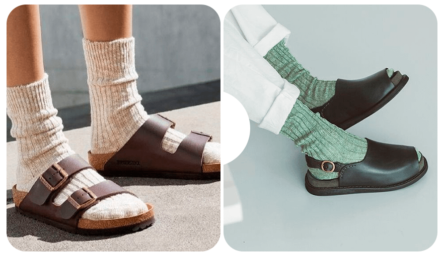 Некоторые модницы даже заменят носки высокими гетрами. Они стильно выглядят в сочетании с биркенштоками и другой открытой, но массивной обувью.
