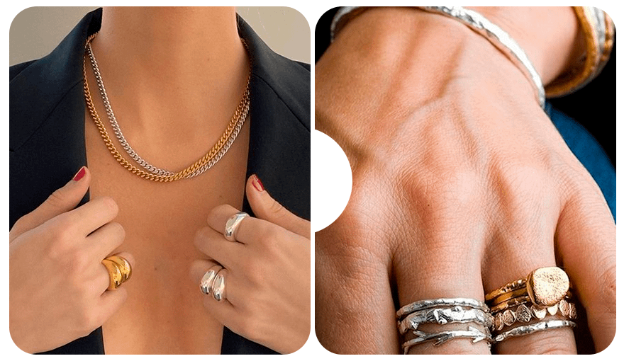 Стильно сочетаются между собой не только серебряные и золотые кольца, но и браслеты. Ты также можешь надеть несколько цепей из разных материалов, если хочешь украсить зону декольте.