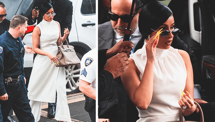 На следующее заседание рэперша пришла в светлом образе: на ней был белый элегантный костюм от Christian Siriano, белые босоножки и, конечно же, сумка Birkin Hermès — на этот раз кофейного цвета. На губах девушки можно было заметить новый пирсинг.