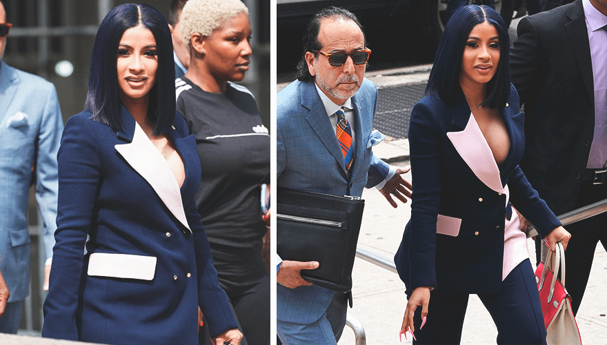 Чтобы в очередной раз предстать перед судом и заявить о своей невиновности, Карди оделась в приталенный темно-синий двубортный костюм с пыльно-розовой вставкой. Такого же цвета были и ее ногти. В оттенок костюму было покрашено ее удлинённое каре. В руках дивы был новый вариант сумки Birkin Hermès цвета фламинго с молочными боковыми панелями.