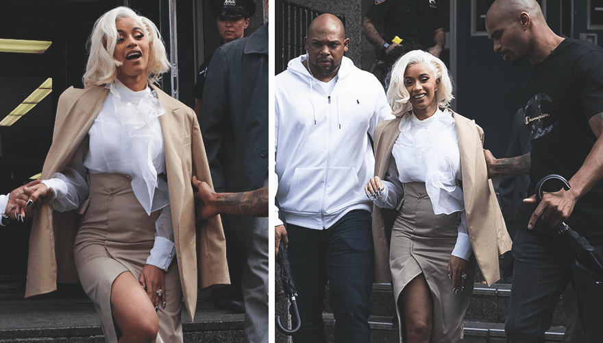 Первый раз Карди появилась в суде в октябре 2018 года, когда ее обвинили в драке с двумя бар-вумен — рэперша подозревала их в связи с мужем. На заседание Карди пришла в образе в нюдовых оттенках и с укладкой в стиле Мэрилин Монро: полупрозрачной блузе с воланами, белыми туфлями на шпильке, бежевым удлиненным жакетом и юбкой украинского бренда WeAnnaBe в тон ему.