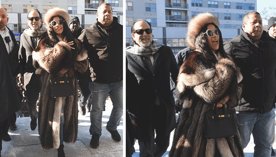 Спустя месяц Карди показала свой новый судебный образ, оформленный в мехах: норковая шуба в пол, бежевая шапка и очки, подобранные ей в тон, черные ботинки с шипами и красной подошвой Christian Louboutin Dovi Dova. Дополнила лук классическая черная сумка Birkin Hermès.