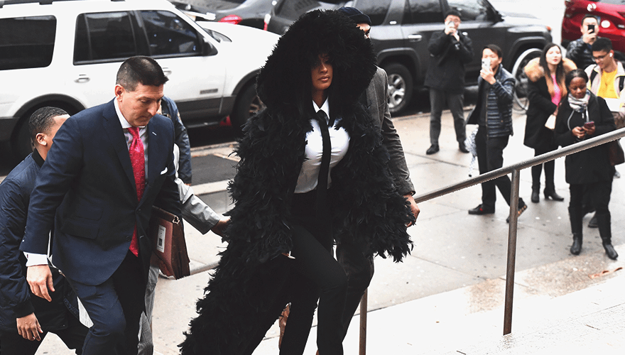 Самым обсуждаемым образом рэперши стало длинное пальто Adrienne Landau с перьями и шлейфом. Над этим луком постарался стилист Карди — Коллин Картер. Предложить исполнительнице посетить суд Куинса (Queens Court) в королевском пальто (Queens Coat) было как минимум иронично. Кроме верхней одежды, Карди была одета в белую рубашку с галстуком, классические брюки и туфли, венцом образа стала черная меховая шляпа с широкими полями.