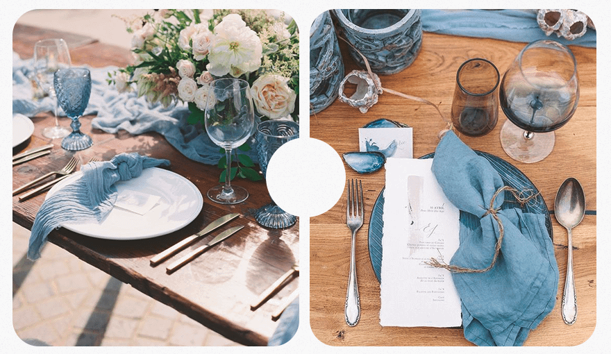 Тонкий и слегка волнистый хлопок — материал, который часто используют для создания многоразовых салфеток. Если хочешь создать свадьбу в морском стиле и заботишься о природе, вместо обычных бумажных салфеток для сервировки используй экологичные многоразовые. Идеально, если они будут в нежно-голубом или зеленом цвете.