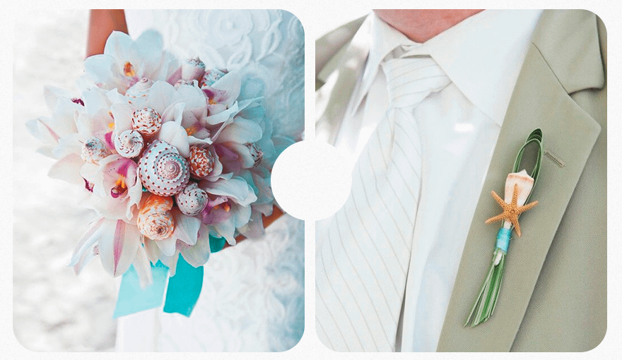 Кстати, классическую бутоньерку жениха также можно заменить красивой морской звездой или необычной ракушкой. Тогда ваши образы будут выглядеть особенно гармонично.