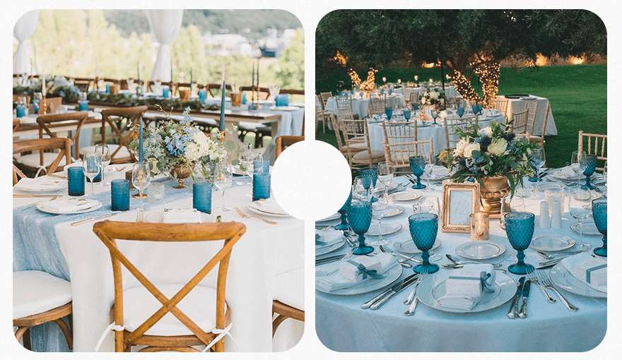 Чтобы картина получилась целостной, используй приборы в золотистом оттенке и укрась стол голубыми свечами в минималистичных подсвечниках. Скатерть может быть белой либо светло-голубой.