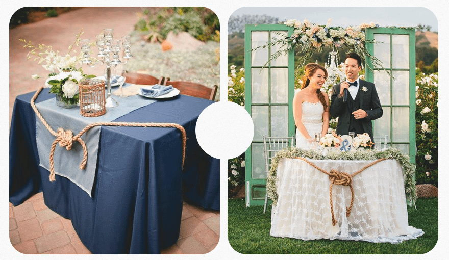 Например, веревку можно завязать в крепкий морской узел и набросить поверх скатерти. У такого украшения может быть и символический смысл — брак влюбленных будет таким же крепким, как и узел.