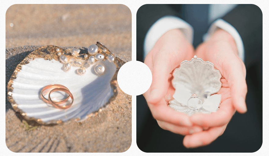 Представить свадьбу в стиле хэмптонс без использования красивых мелочей, вызывающих ассоциации с морем, невозможно. Одной из таких деталей может стать морская раковина, в которой будут храниться обручальные кольца.