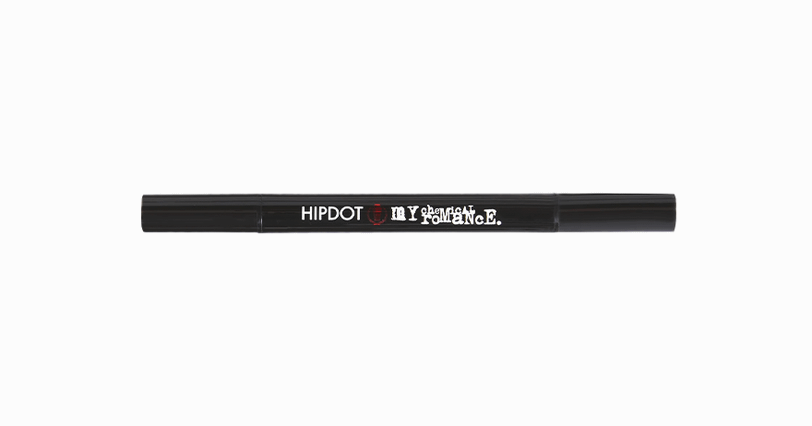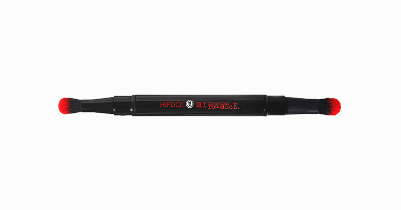 В коллекцию вошла двусторонняя кисть для растушевки теней, а также жидкая подводка с двумя аппликаторами разной формы. На обеих есть черно-красно-белый логотип, который можно увидеть на многих продуктах My Chemical Romance.