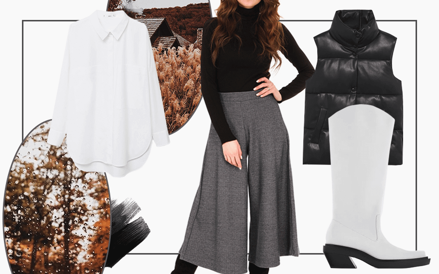 Классическая рубашка и брюки-кюлоты — сочетание в меру строгое, которое особенно пригодится тем, кто вынужден соблюдать дресс-код. С остальным можно не ломать голову и носить, что удобнее. Мы предлагаем добавить объемный жилет из искусственной кожи, а если слишком холодно, то стеганый анорак с поясом и сапоги в стиле кантри — получится нескучное комбо, которое пригодится не на один год.