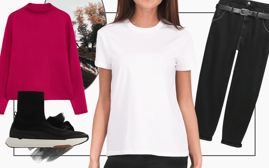 Этот комплект, включающий белую футболку, джемпер и джинсы, самый что ни на есть базовый и его сложно чем-то испортить. Если тебе кажется, что он слишком простой и скучный, предлагаем сыграть на контрасте. К белой футболке и голубым джинсам подбери джемпер и обувь ярких оттенков. Что касается последнего, это могут быть кроссовки с необычной подошвой, ботильоны с крокодиловым тиснением или сапоги с квадратным носком.