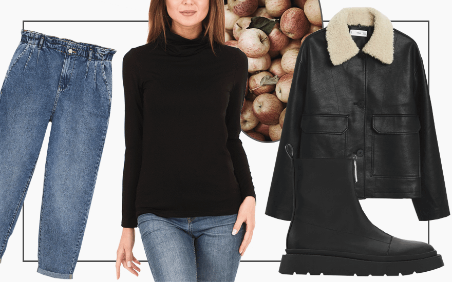 4. Водолазка, джинсы, байкерская куртка, ботинки