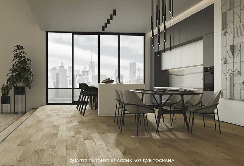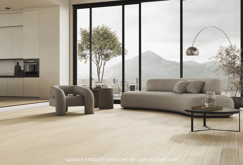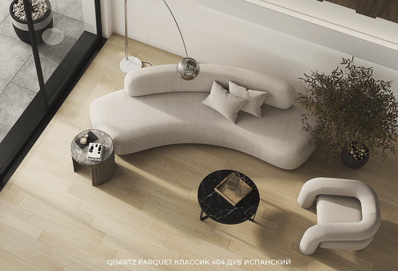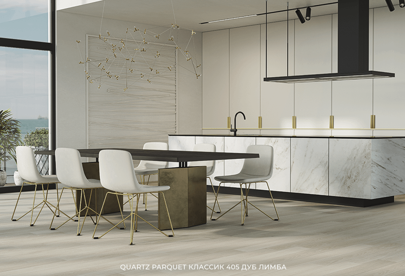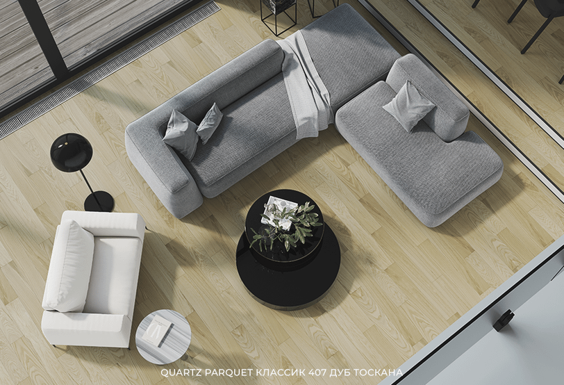 Напольные покрытия из натуральных материалов выглядят актуально и дорого. Кварцевый паркет сочетает в себе преимущества натурального дерева с практичностью. Технология производства — 48 часов под прессом — делает такой пол надежным и долговечным. Основной слой кварцпаркета — стабильная SPC-плита. Затем идет слой натурального дерева, который защищен семью слоями лака.