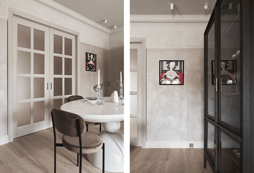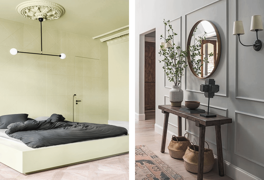 Панели можно использовать и как самостоятельный элемент декора. Молдинги в цвет стен добавят объема, а яркие или контрастные могут стать центром дизайна комнаты и задать помещению ритм. Главное — соблюдать баланс и не перегрузить зону деталями. Лепнина может «съесть» высоту потолков и пространство станет казаться меньше.