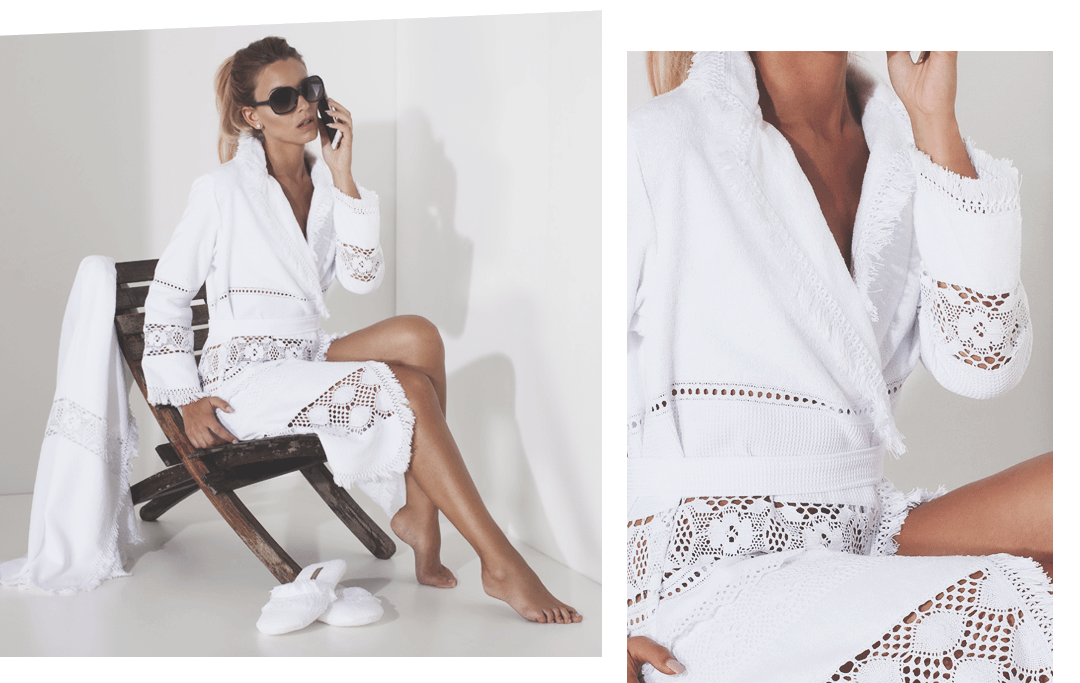 Для начала познакомься с махровым халатом класса люкс, который сделан на 100% из мягкого и легкого хлопка, что без сомнения будет приятно касаться твоего тела в любой из холодных вечеров, который ты предпочтешь провести за чашкой горячего чая или бутылкой красного вина. Халат белый, завязывается поясом на запах. Если говорить о длине, то в ней нет излишеств: она средняя, именно такая, какая и нужна для удобства в носке. В качестве декорирования итальянский производитель использовал ажурное шитье, а также вставки из рельефной ткани. Края халата отделаны прекрасной бахромой.