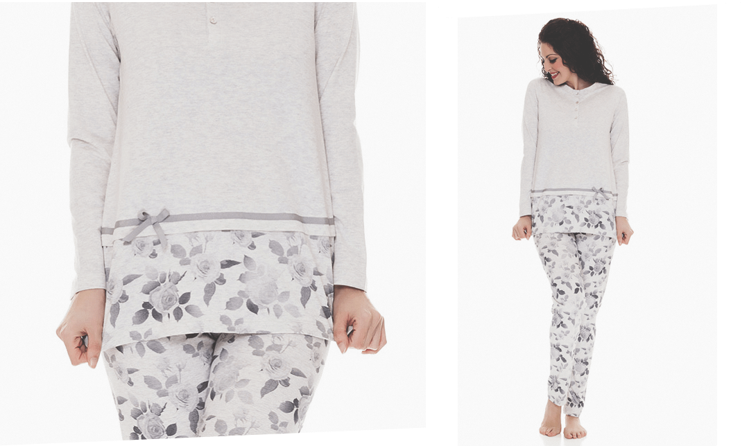 И, наконец, вариант для тех, кто привык носить брюки, а не юбки. Теплый домашний костюм от итальянского бренда B&B сделан из 100% хлопка высокого качества, причем ткань размещена таким образом, что снаружи костюм гладкий на ощупь, а изнутри байковый. Кофта слегка удлиненная для более комфортного ношения в контексте дома, плюс имеет небольшую застежку на перламутровых пуговицах. В качестве украшения используется бантик. Брюки, меж тем, выделяются красивым рисунком с цветами, как и нижняя часть кофты. Ты это наверняка смогла заметить и раньше. Крой у брюк прямой, поэтому ждать стеснения не придется.