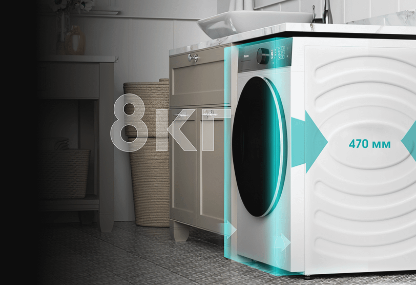 Пример — стиральная машина Hisense WF5I8043BWF. При глубине всего 47 см она рассчитана на загрузку до 8 кг — подойдет для большой семьи.
