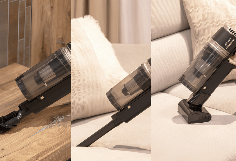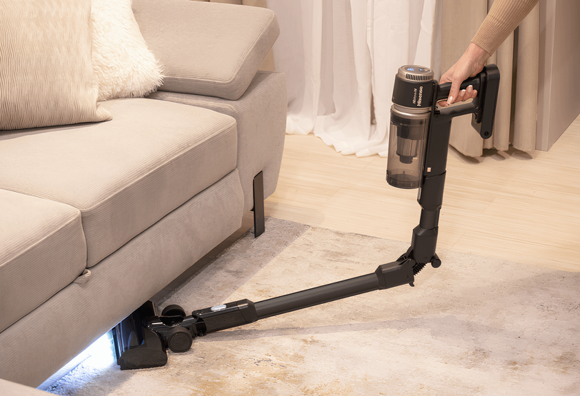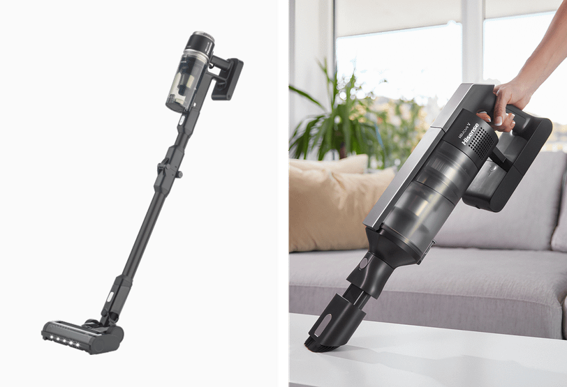 Благодаря инверторному мотору мощностью 550 Вт и мощности всасывания 190 Вт беспроводной вертикальный пылесос Hisense HVC646541A справляется и с крошками на кухне, и с шерстью на ковре. Умная турбощетка сама распознает тип поверхности и подстраивает работу. А LED-подсветка поможет не пропустить пыль в темных зонах.