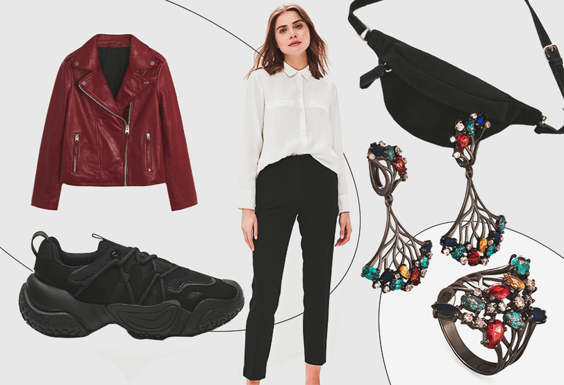 Для похода в бар с друзьями можно собрать практичный и слегка дерзкий образ: накинь поверх рубашки кожаную байкерсую куртку, желательно яркого оттенка, надень кроссовки на объемной подошве, в которых ноги не устанут танцевать, и дополни образ поясной сумкой. Последняя и обязательная деталь — яркие украшения с фианитами, которые будут сверкать в свете софитов. Получится стильно, удобно и применимо на каждые выходные.