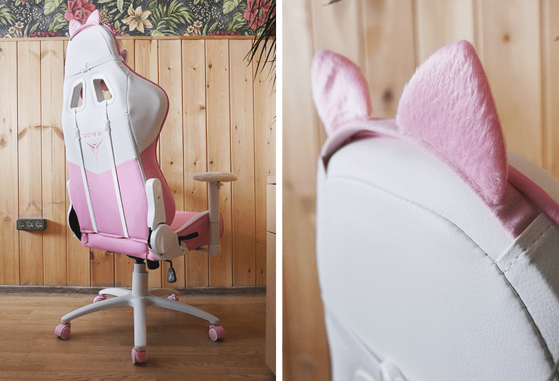 Дизайн кресла, действительно, броский: бело-розовая гамма, выразительные линии, мягкая экокожа. Самая очаровательная деталь — кошачьи ушки на ободке, который крепится к изголовью. Кресло целый день собирало заинтересованные взгляды и комплименты: каждый сотрудник редакции обратил на него внимание, пощупал и протестировал. Вопреки стереотипам, мужчины его тоже по достоинству оценили: одни воображали, как забавно было бы в нем стримить какой-нибудь брутальный шутер, собирая донаты, другие — деловито хвалили функциональность и комфорт, грустно вздыхая, когда приходилось встать с него и вернуться в родное, офисное.