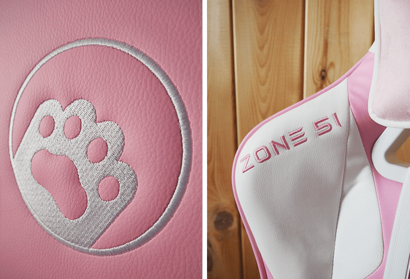 Анатомические подушки под поясницу и шею выполнены из нежной, тактильно приятной замшевой ткани. Из нее же сделаны мягкие чехлы на подлокотники. Этот материал еще называют «антикоготь» — он устойчив к механическим повреждениям, в том числе к кошачьим царапинам, не протирается, не выгорает и не трескается. Также кресло украшено аккуратной, ровной вышивкой — название, логотип бренда и розовая кошачья лапа по центру спинки.