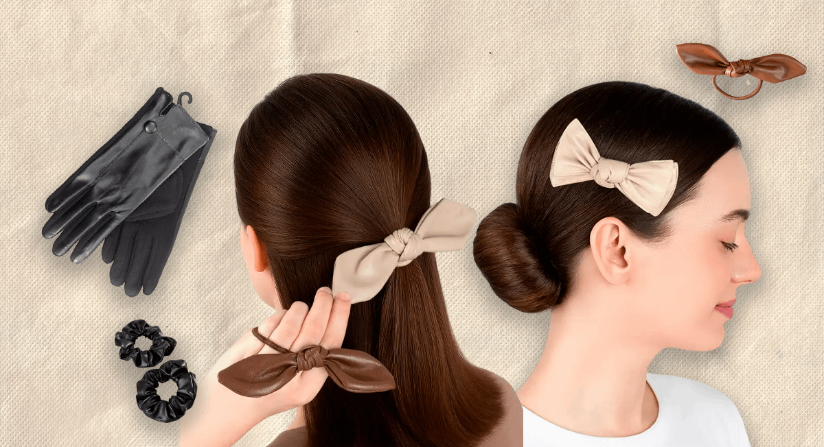 Аксессуары для волос из экокожи. В зависимости от исполнения делают образ как строгим, так и романтичным. Банты на резинках и заколках-крабах из коллекции кожаных аксессуаров Fix Price отлично подойдут.
