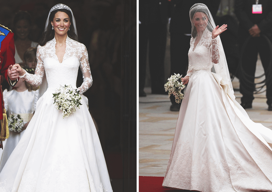 Второе по секретности платье после наряда принцессы Дианы: о дизайнере платья и примерном концепте ничего не было известно до самой свадебной церемонии. Лишь потом стало известно, что его разработала Сара Бертон, креативный директор Alexander McQueen. Наряд обладал v-образным вырезом, девятиметровым шлейфом и кружевным верхом, а также набивкой на бедрах и корсетом в викторианском стиле. Миддлтон также учла традиции, добавив в образ новые серьги от родителей, синюю ленту, вшитую в платье, позаимствованную у королевской семьи тиару и кружево, сделанное по старинной технологии.
