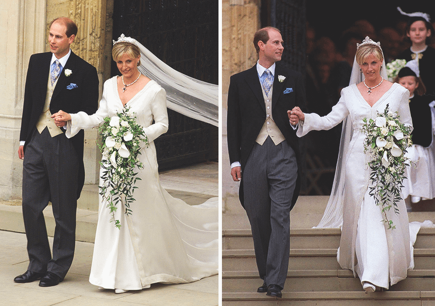 Для того, чтобы произнести клятвы с принцем Эдвардом, она выбрала платье от Саманты Шоу, украшенное 325 тысячами кристаллов и жемчужин. Из украшений на Софи были тиара из частной коллекции королевы, черно-белое жемчужное ожерелье и серьги, дизайн которых разработал ее будущий муж в качестве свадебного подарка.