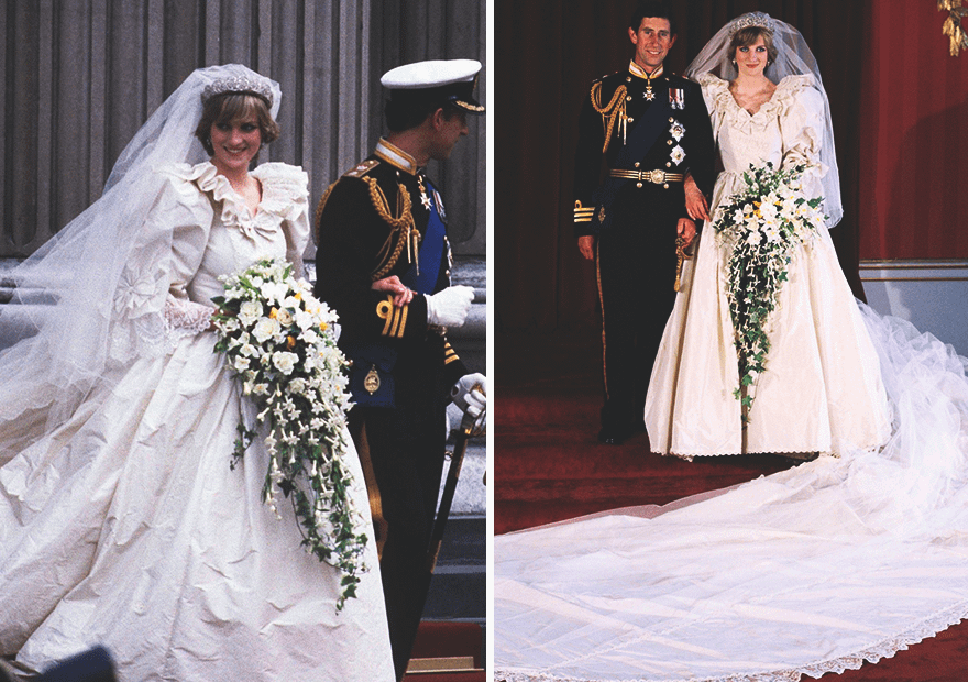 Свадебное платье Дианы Спенсер остается одним из самых культовых — все благодаря его элегантности и женственности. Наряд спроектировали Дэвид и Элизабет Эммануэль, сочетавшие в нем основные принципы: подвенечный образ должен обладать чем-то старым (кружевом, оставшимся от королевы Марии), новым (это был дизайн платья), позаимствованным (тиара, принадлежавшая семье Спенсеров) и синим (бантик, вшитый в пояс).