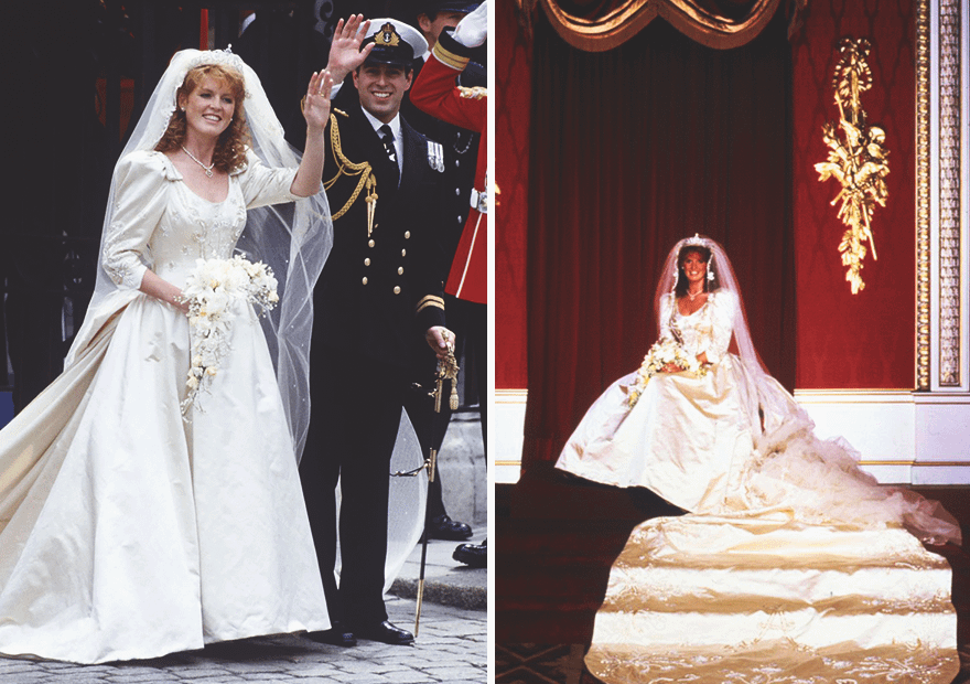 Ее платьем занималась Линдка Сиерак, создавшая пышный наряд из атласа цвета слоновой кости. В образе было много ассоциаций с жизнью молодой семьи: ткань расшили бисером и инициалами молодоженов, а также якорями и волнами — они напоминали о морском прошлом принца Эндрю.