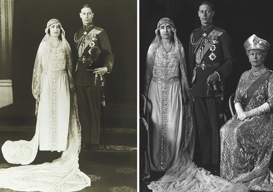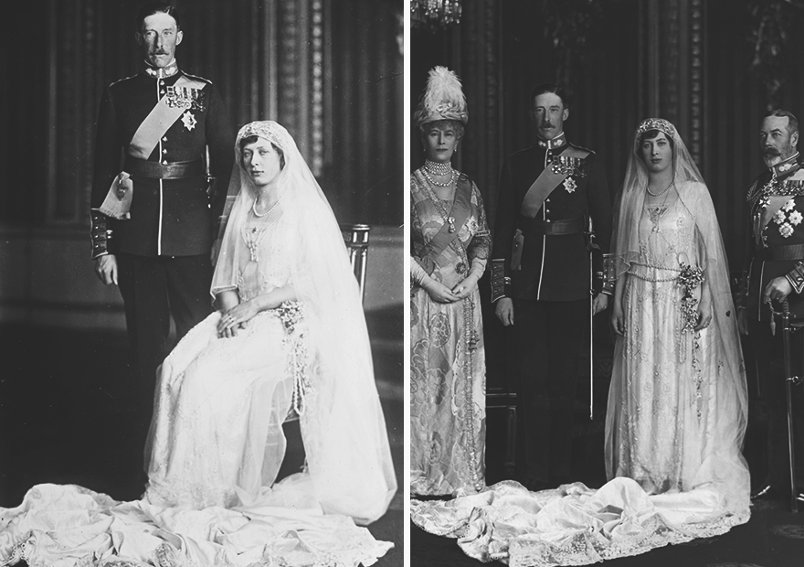 Для ее свадьбы с Альбертом Йоркским, проведенной в 1923 году, Хэндли Сеймур разработала платье из шелкового креп-муара с заниженной талией. Вдобавок наряд вышили серебряной нитью и жемчугом. Довершала образ фата «шапочка Джульетты» из тонкого кружева.