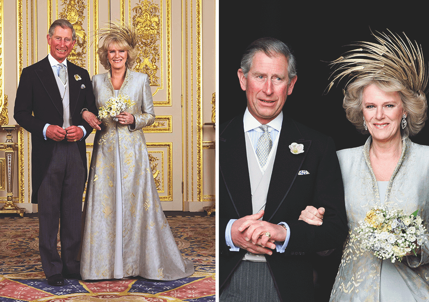 На вторую свадьбу с принцем Черльзом в 2005 году Камилла Паркер-Боулз надела кремовое платье с расшитым верхним слоем от Robinson Valentine. Акцент был сделан на строгих прямых линиях в силуэте, призванных сделать наряд сдержанным. Вместо фаты Камилла отдала предпочтение шляпке с перьями от Филиппа Трейси.