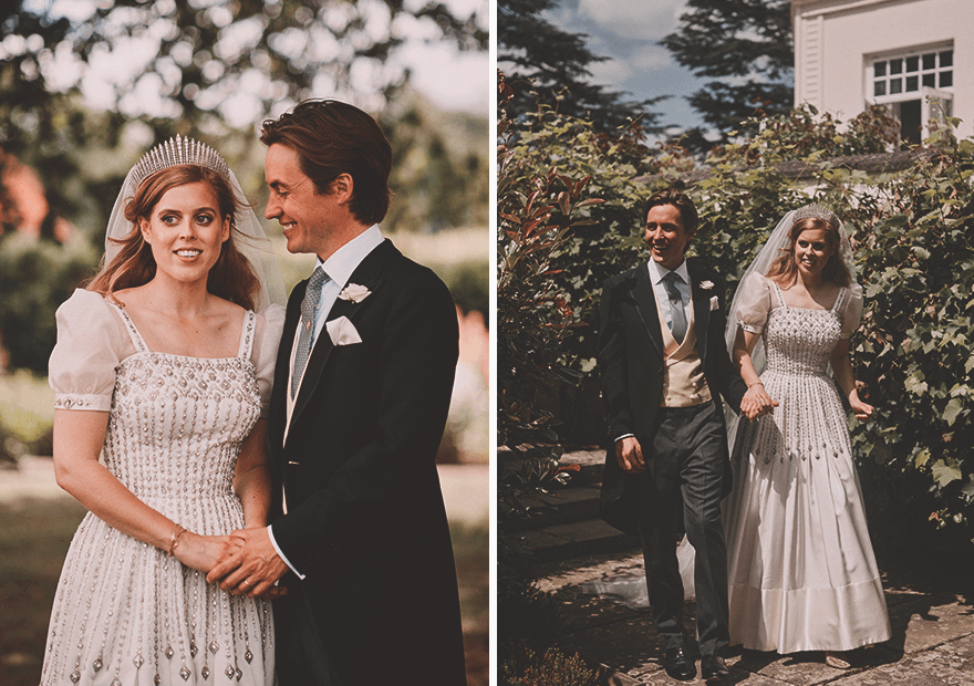Если бы не пандемия, мы могли увидеть совсем иную версию наряда. Однако принцессе и ее избраннику, Эдуардо Мапелли Моцци, пришлось провести микросвадьбу. Беатрис решила нарушить семейную традицию и не заказывать новый наряд. Вместо этого она взяла винтажное платье от Нормана Хартнелла, сделанное для Елизаветы II. Невеста дополнила его рукавами-фонариками и шелковой отделкой подола. Тиару Беатрис также позаимствовала у бабушки.