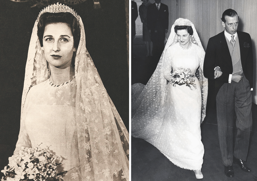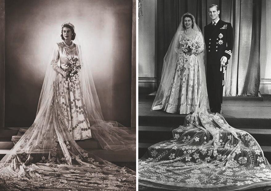 Она сыграла церемонию с Филиппом, герцогом Эдинбургским, в 1947 году, когда Вторая мировая война едва закончилась. Молодой королевской семье мало того, что пришлось закупать материалы для платья на продовольственные талоны, так еще и выбирать ткани, исходя из политических мотивов. Так, наряд был сделан не из японского или итальянского шелка (эти государства все еще считались идейными врагами), а из китайской ткани. Дизайнер Норман Хартнелл и его команда расшили получившееся платье десятью тысячами жемчужин. Изготовление заняло семь недель: все это время наряд украшали 350 вышивальщиц.