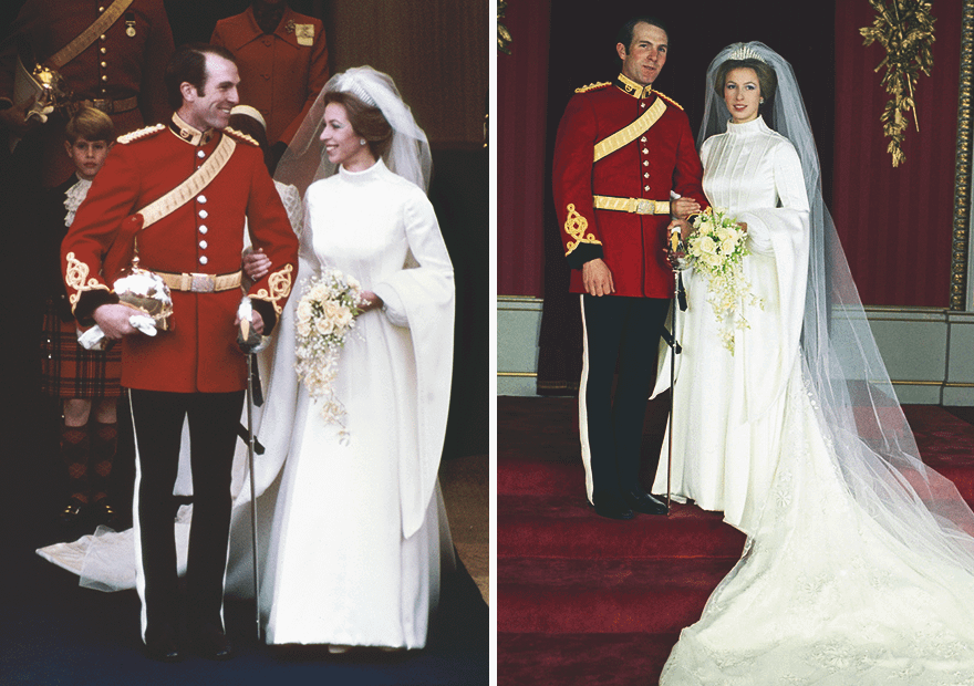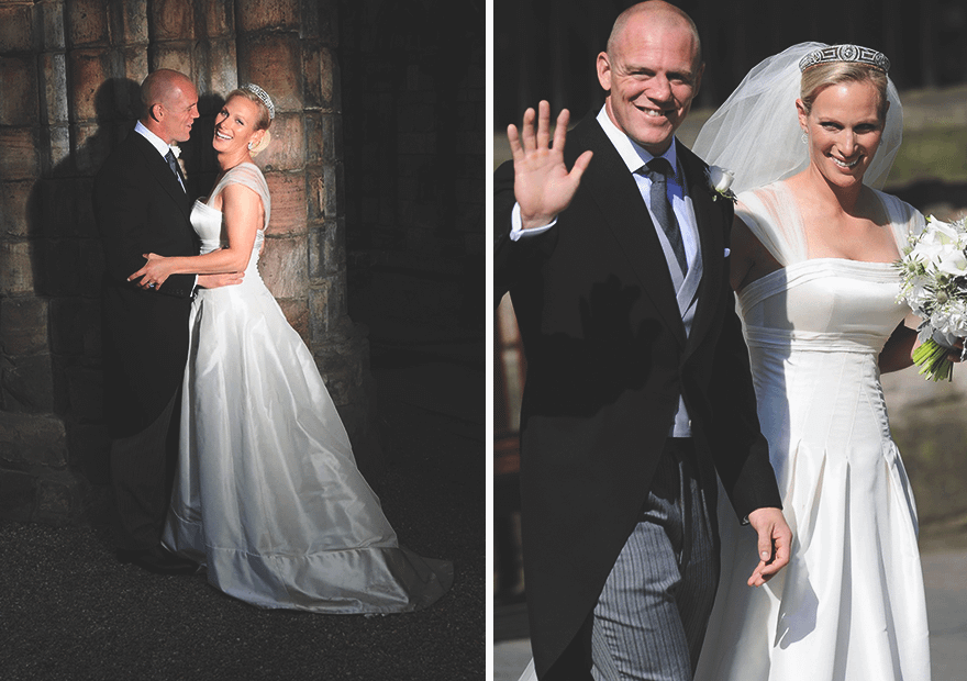 Единственная дочь принцессы Анны вышла замуж в белом шелковом платье с корсетом. Объем в наряде достигался за счет подъюбников. Хотя дизайнеры отказались от традиционных мотивов вроде кружевных орнаментов или пышных рукавов, характерных для британских королевских свадебных образов, платье для Зары выглядело эффектно за счет минимализма.