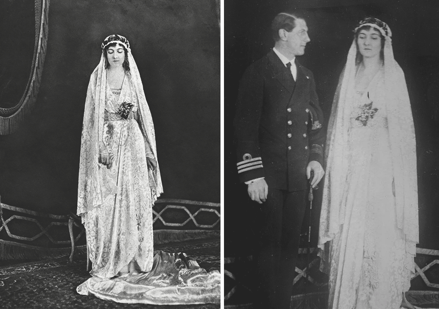 Младшая сестра Маргарет и еще одна внучка королевы Виктории, обручившаяся с Александром Рамзи в 1919 году, выбрала платье, отвечавшее модным тенденциям того времени: талию женщины скрывала драпировка. Длинная фата «шапочка Джульетты», достающая почти до пола, была сделана из плотного кружева и закреплялась на голове с помощью венка.