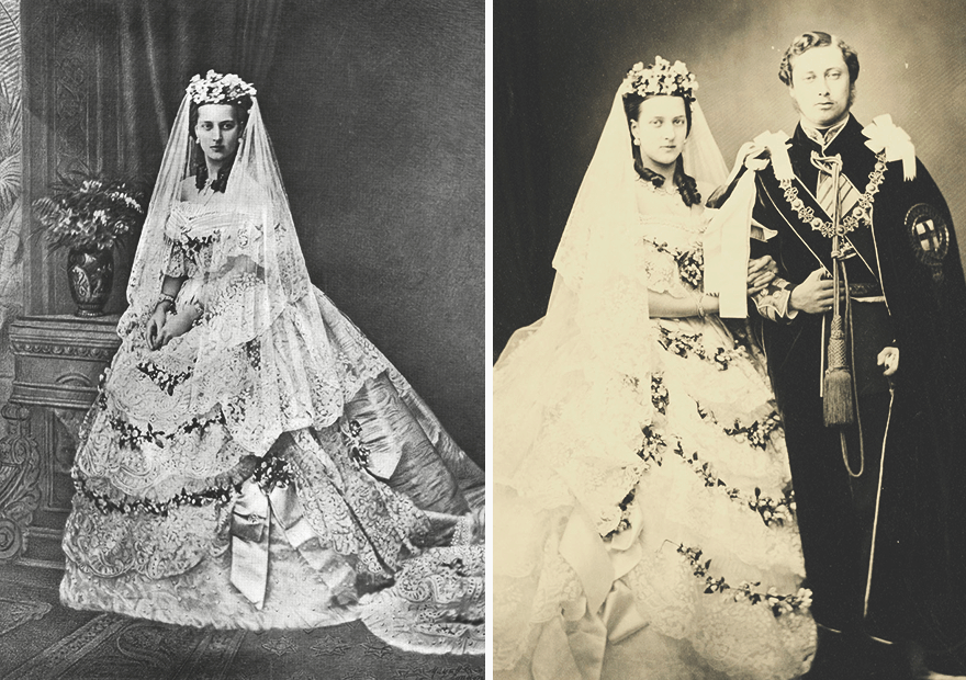 В 1863 году Альберт Эдуард Уэльский, старший сын королевы Виктории, женился на принцессе Дании Александре. Для невесты изготовили шелковый наряд, обильно украшенный тюлем, кружевом хонитон, цветками апельсина и мирта. Эти же соцветия, к слову, были и в украшениях для прически.