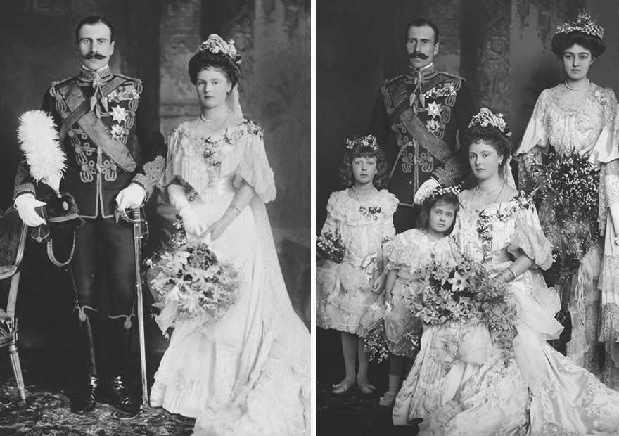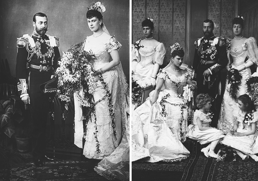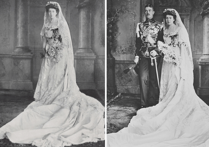 Если в 19 веке и было детализированное до мелочей платье, то оно принадлежало невесте Георга V: атласное платье с серебряной подкладкой было полностью расшито кружевом хонитон, декорировано страусиными перьями и цветками апельсина. К слову, свадьба вообще могла бы не состояться: Виктория Мария поначалу отказала возлюбленному в помолвке, находясь под влиянием англофобки-матери. Однако позже пара прошла через череду неловкостей и связала себя узами брака.