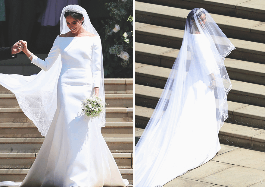 К минимализму тяготела и герцогиня Сассекская, надевшая платье от тогдашнего креативного директора Givenchy Клэр Уэйт Келлер. Вырез-лодочка, шелк как основной материал, скромная вуаль и едва заметные украшения — вот секрет успеха образа Маркл. К слову, с походом в платье к алтарю помогала лично Келлер.