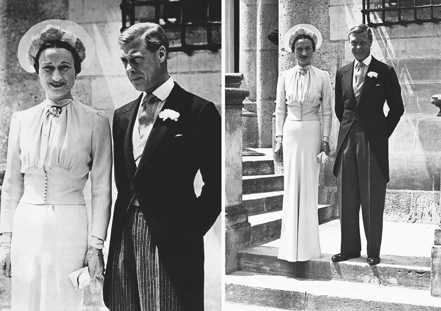 Платье настолько же скандальное, насколько громкой была свадьба: в 1937 году Эдвард, герцог Виндзорский, отрекся от престола, чтобы жениться на дважды разведенной светской львице. На свадьбу Кэролайн надела платье из шелкового крепа, созданное американцем Майнбоше — он выкрасил наряд в бледно-голубой оттенок. Вместо вуали или фаты Симпсон пришла на церемонию в шляпке от Кэролайн Ребу.