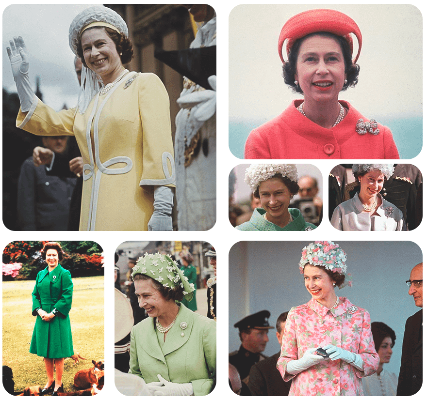 Спустя еще несколько лет королева стала все чаще появляться на публике в однотонных твидовых костюмах. Дополняли образ необычные шляпки и туфли-лодочки на низком каблуке. Над созданием образа Елизаветы II в те годы работали дизайнеры Харди Эмис и Фредди Фокс. Последний значительно пополнил коллекцию королевских шляпок. А также закрепил за ними звание самого узнаваемого элемента монаршего гардероба.
