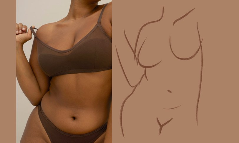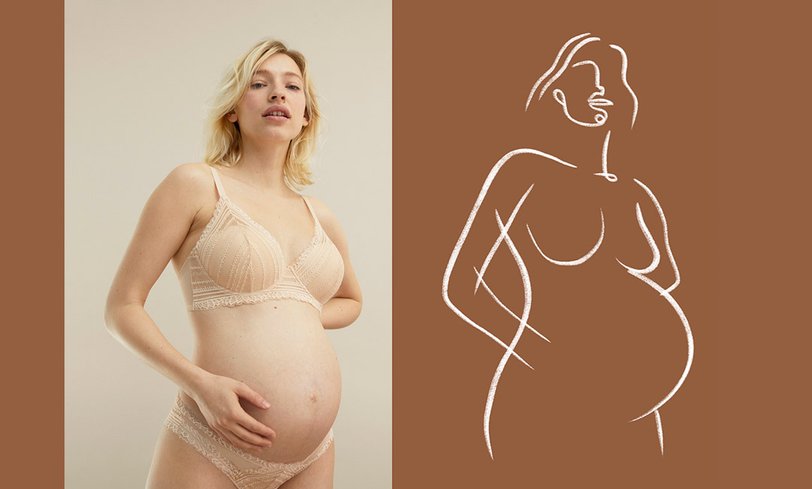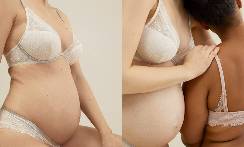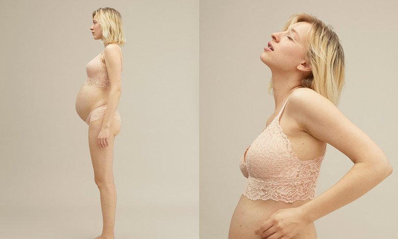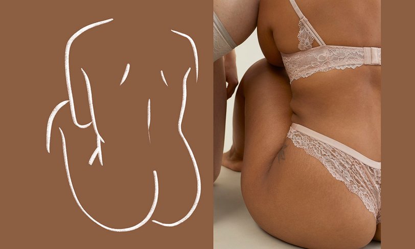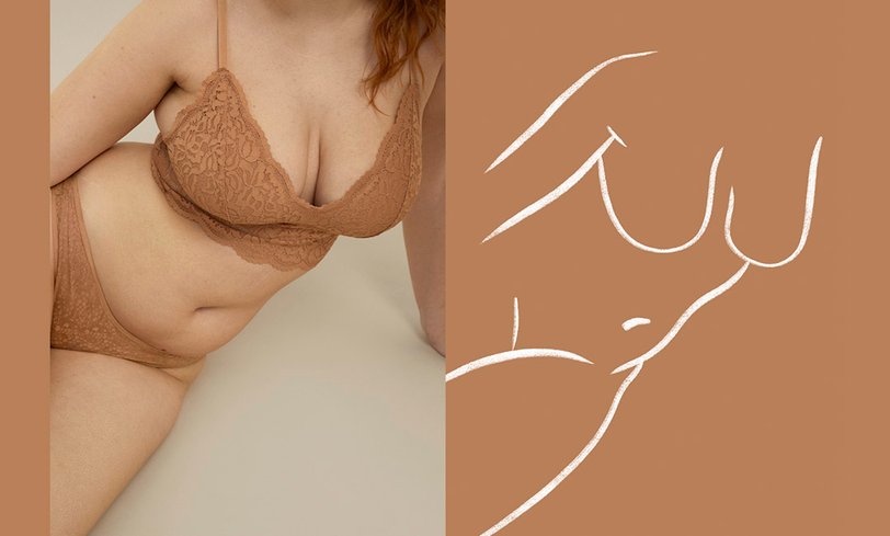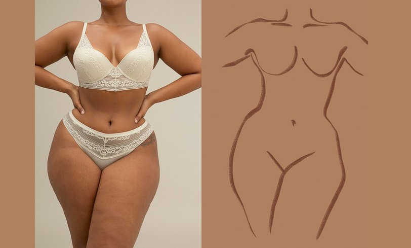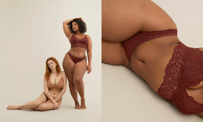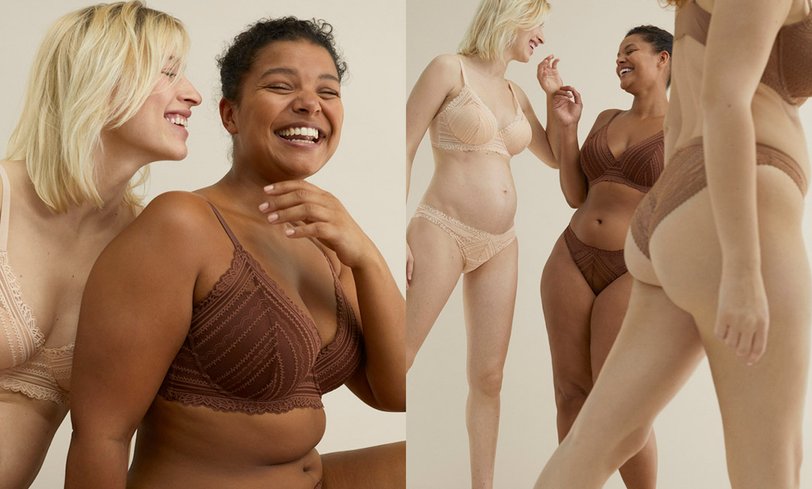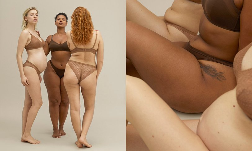 На фото мы видим женщин с разной фигурой, не привязанной к устаревшим стандартам красоты: первая — афроамериканка с пышными формами, вторая — беременная девушка, а третья — с крупными бедрами. Все одеты в нюдовое кружевное белье, подчеркивающее особенности их тел.