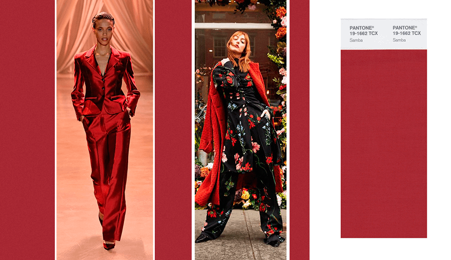 Знойный красный цвет отвечает в подборке за энергию. Надевая монохромный образ, будь готова к тому, что он может оказаться смелым, как это вышло у Christopher John Rogers, сделавшего атласный брючный костюм оттенка самба. Он хорошо сочетается с нейтральными цветами вроде слоновой кости, белым или черным. Этим воспользовался дом Lela Rose, дополнивший образ с цветочными принтами ярким пальто.